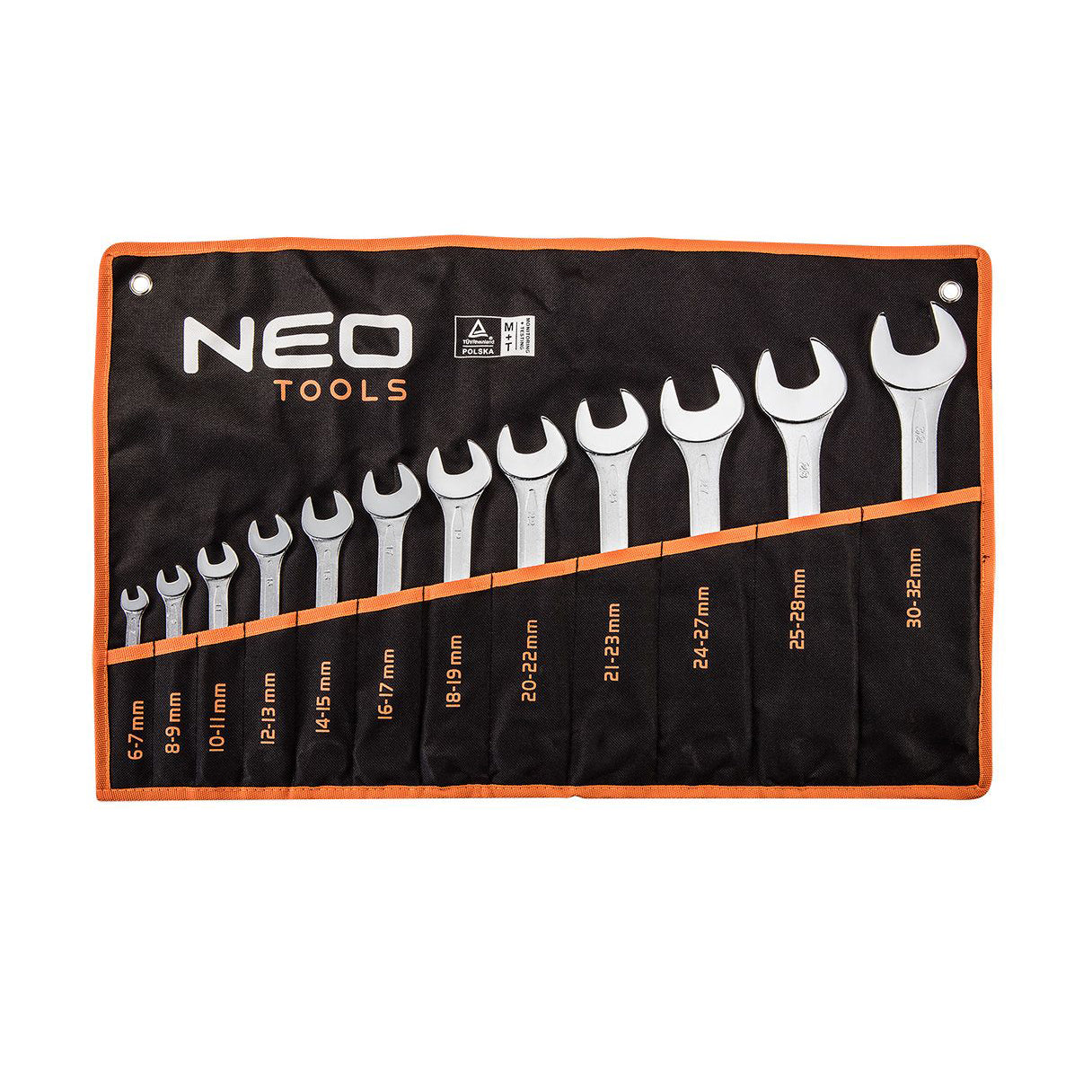 NEO combination spanner set (ref. 09-852) contains 12 spanners in popular sizes (6-32 mm), made according to DIN 3110. The high-quality chrome vanadium steel ensures long-term durability of the spanners. The tools are supplied in a practical case with printed key dimensions for easy organisation. The quality of the tool is confirmed by the T?V certificate and a 25-year manufacturer's warranty. NEO brand meets the expectations of professionals.