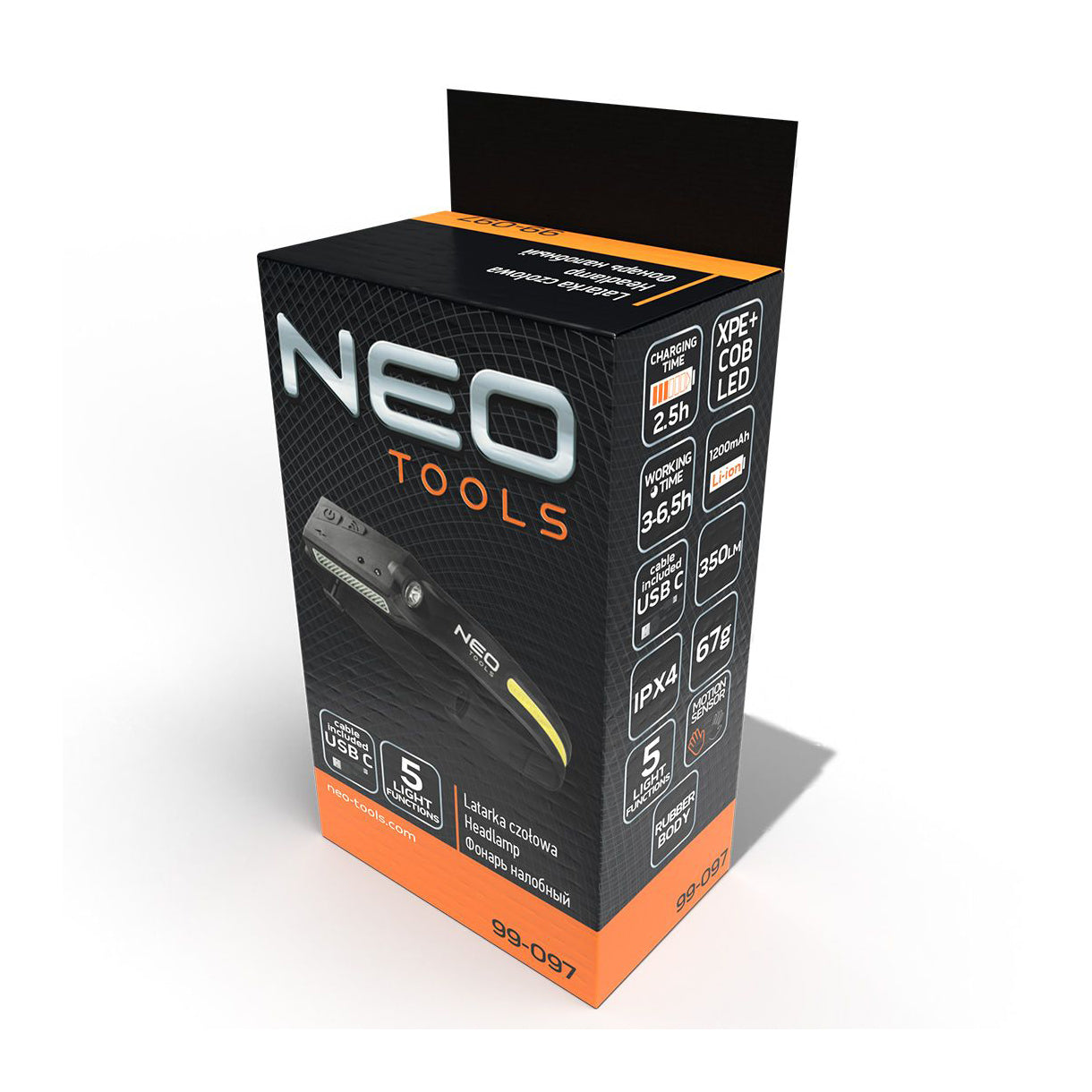 The LED belt 2-in-1 head torch 99-097 by NEO features XPE 120 lumens 3 W and COB 350 lumens 5 W. It has a touch-sensitive switch, affecting the intensity of the light - from strong to medium to long. The built-in 1200 mAh lithium-polymer battery with an operating voltage of 3 to 4.5 V needs 2.5 hours to fully charge. A USB C cable is included in the kit. The flexible casing of the torch is made of rubber. The device is IPX4 rated and weighs 95g. The torch has functions: first function - high COB illumination: 350 lumens, burn time 2.5 - 3h; second function - COB low brightness: 130 lumens, burn time 3.5 - 4h; third function - XPE high illumination: 120 lumens, lighting time 4 - 4.5h; fourth function - XPE low light: 50 lumens, lighting time 6 - 6.5h. The device has a diffused light, suitable for various works. Convenient to store. The NEO brand torch is recommended for a wide range of applications.