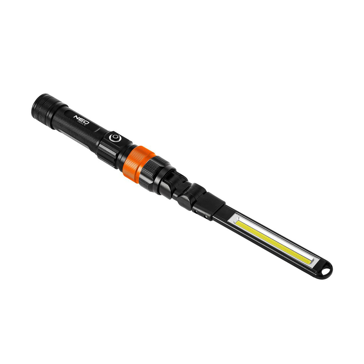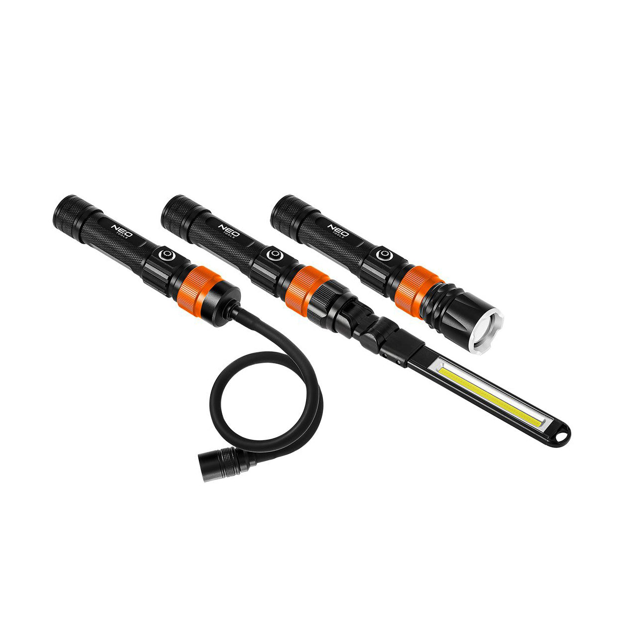 The 3-in-1 lamp, 99-107 from the NEO TOOLS brand is a 3-in-1 device with three interchangeable heads: a lamp with a moving head, a lamp with a head on a flexible arm and a torch. Thanks to the CLICK function, the heads are easy to replace . They are characterised by a maximum of 350 lm and COB LED technology. The torch has a range of up to 150 metres and a magnet in the base allows it to be attached to metal countertops without tools. The device is waterproof (IP44). The aluminium handle makes it comfortable to use and the built-in ZOOM enhances its capabilities. The 3-in-1 NEO TOOLS lamp has a 2200 mAh 3.7 V lithium-ion battery that charges via the USB C charging connector with the included cable. The charging time is 4 hours and the operating time is 6 to 8 hours. The charge indicator on the button allows you to control the charging process.