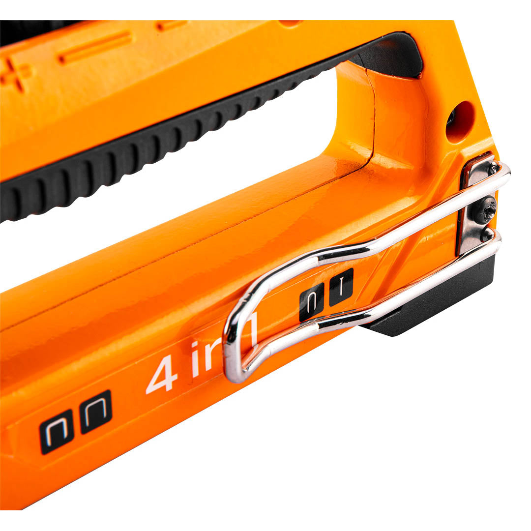 NEO 4 in 1 multifunctional upholstery stapler (ref. 16-030) for staples type J G L E size 6 to 14mm. It is perfect for upholstery work decorating fixing foil leather and other materials. Thanks to the staple driving force adjustment it can be used for both hard and soft materials. Precisely hits staples without crushing them even in hard materials. The body of the stapler is made of aluminium.