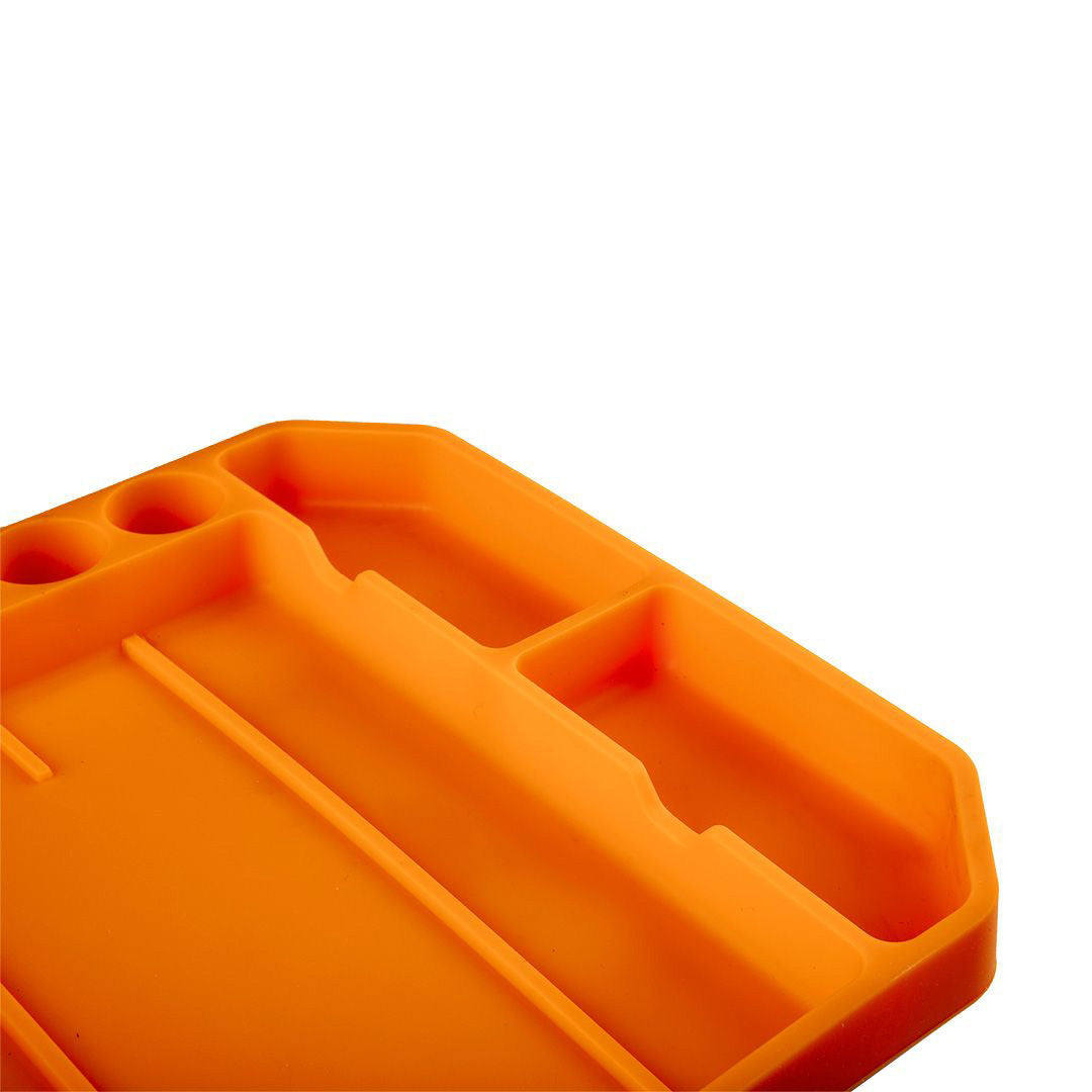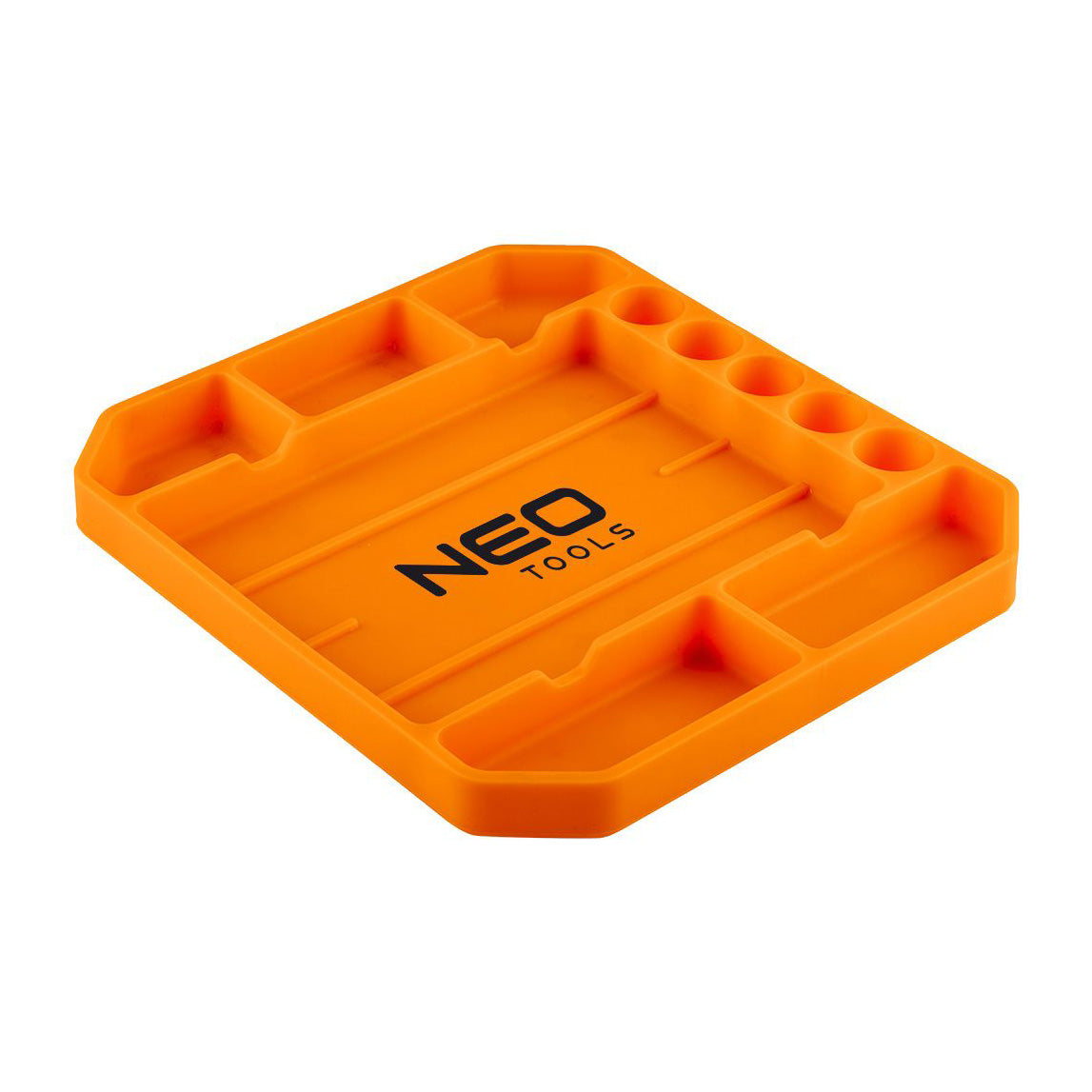 Tool tray, silicone 25.7 x 23.2 x 2.5 cm 10-481 by NEO made of flexible and non-slip silicone. It features dimensions of 25.7 x 23.2 x 2.5 cm and a depth of 20 mm to prevent tools from falling out. It has 6 practical pockets and 5 cap holders. The material protects the accessories stored in it from damage. Recommended for keeping order in the workshop and warehouse.