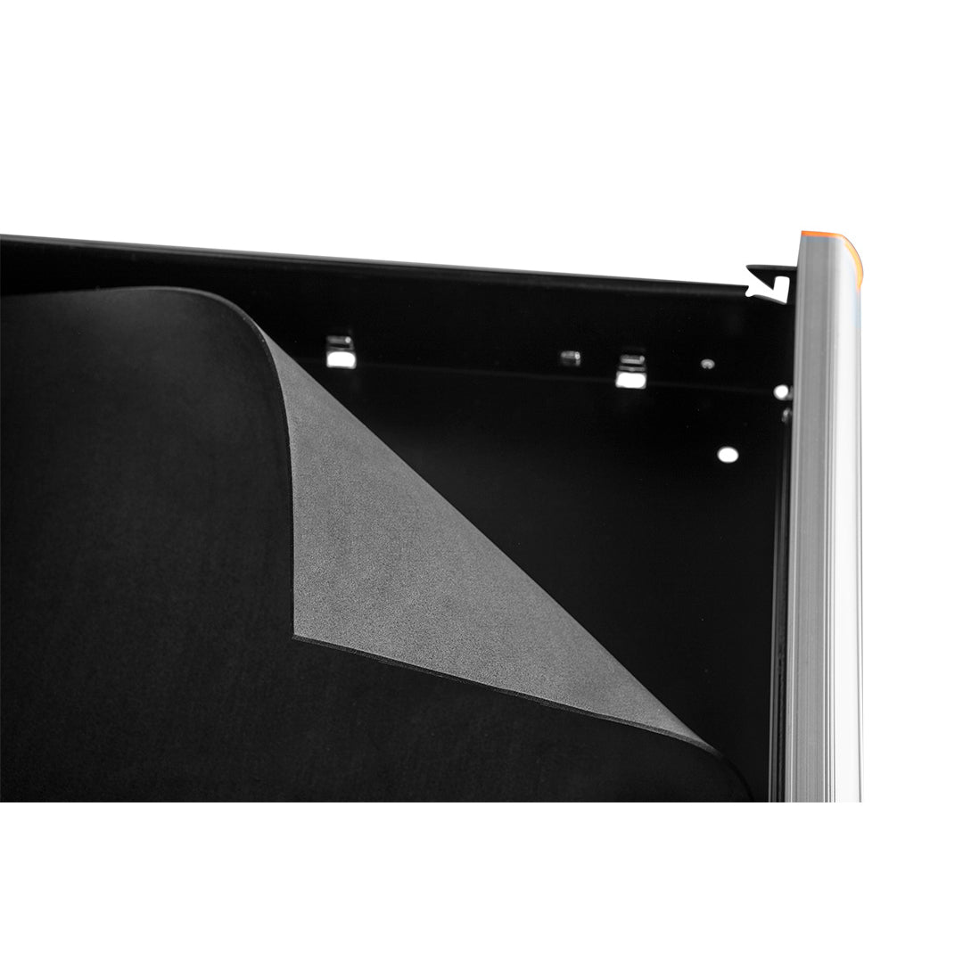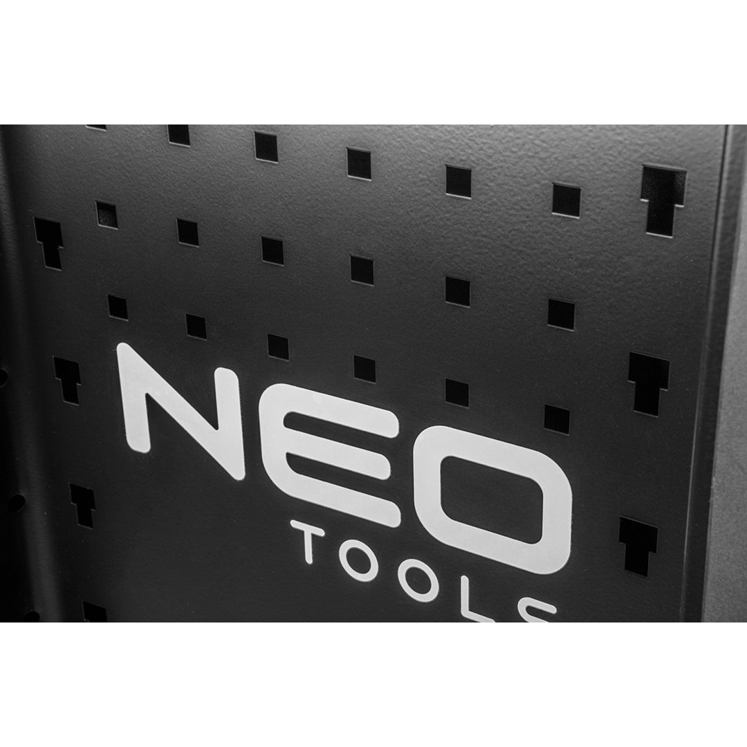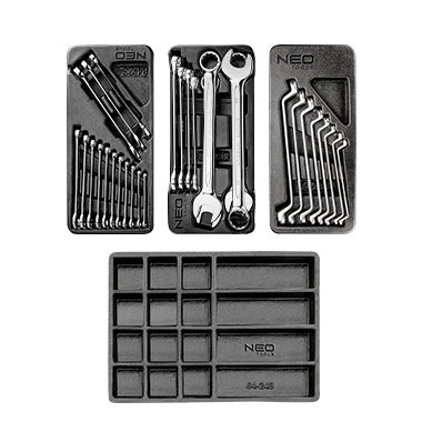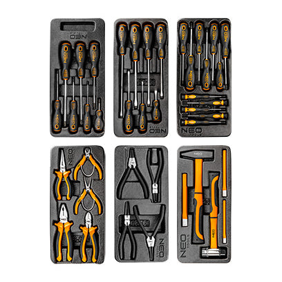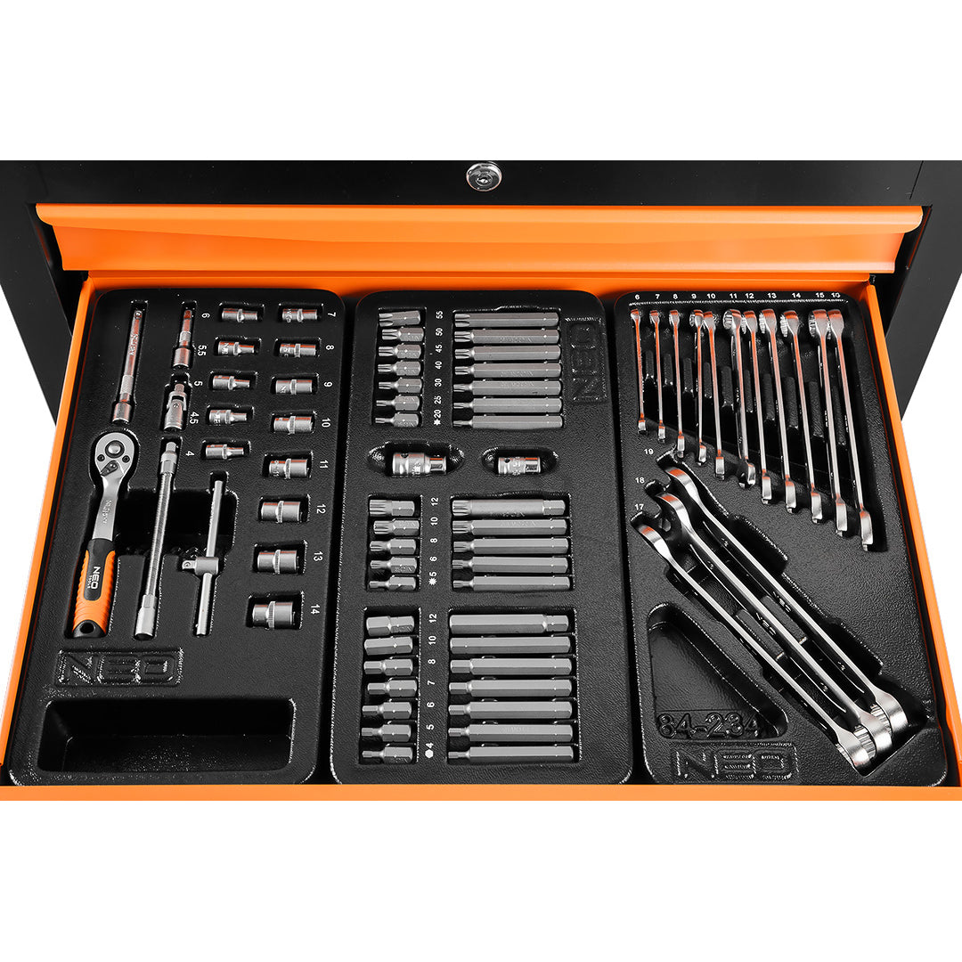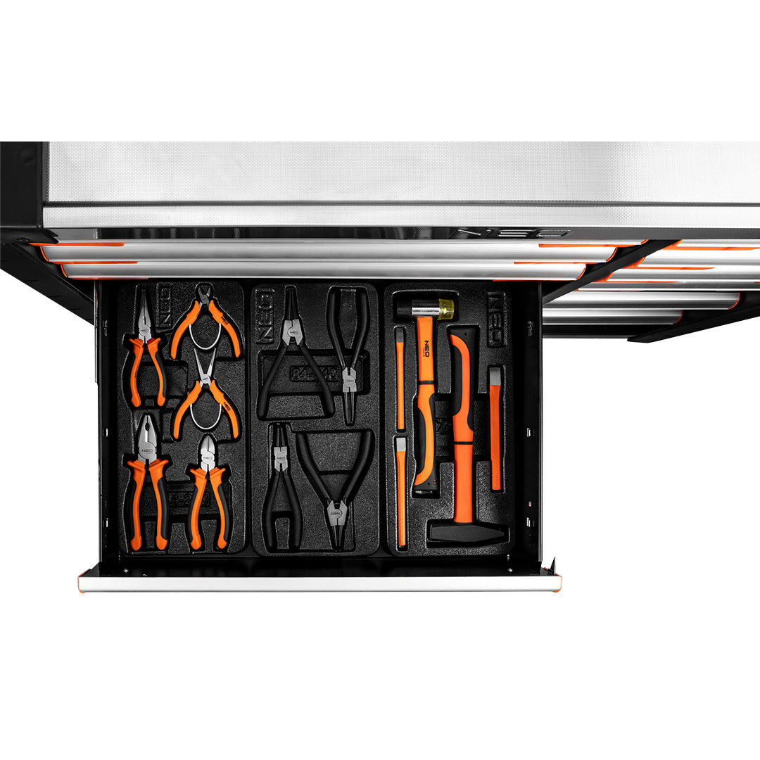 The PRO Workshop Cabinet 12 drawers 229 items 84-225+G by NEO comprises a complete set of accessories and has 12 capacious drawers - including 6 large drawers where 3 are low 560 x 400 x 60mm and 3 high 560 x 400 x 139mm and 6 small drawers including 3 low 252.5 x 400 x 60 and 3 high 252.5 x 400 x 139mm. The total dimension of the cabinet with wheels is 110.5 x 46.5 x 97.8 cm (height without wheels is 82.5 cm). The cabinet has a steel body and has a load capacity of 600 kg. The aluminium top with spaces for screwdrivers and accessories as well as the side perforation with space for hooks and NEO brand products extend the range of use of the cabinet. Corner bumpers a side handle and a drawer lock also prove useful. Ball-bearing slides and the ability to open drawers 100% allows the cabinet to be used comfortably. In addition they are compatible with NEO brand tool inserts and fitted with 2mm high EVA mats. The cabinets are centrally locked (two keys are included). A wheel lock ensures safe working conditions. The equipment includes products from SKU: 84-249 84-247 84-246 84-242 84-241 84-240 84-239 84-238 84-237 84-236 84-235 84-234 84-233 84-232 84-231 84-230. The PRO Workshop Cabinet with 229 NEO brand accessories is a guarantee of quality for many years of use.
